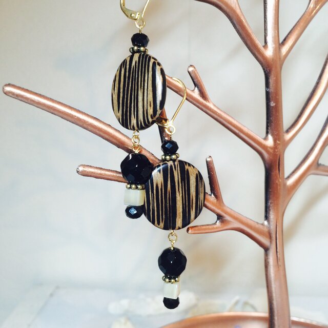 宝石質のブラックスピネルにオニキス、ストライプ模様のウッドビーズを合わせた
