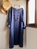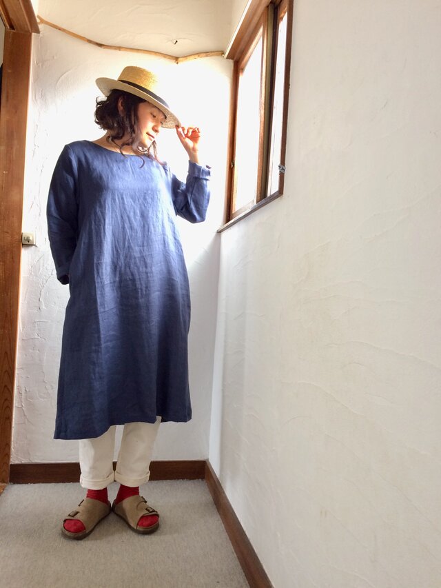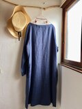 リネン100 シンプルAラインワンピース スモークネイビーブルー