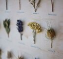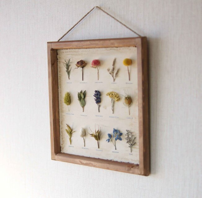 アンティーク調に仕上げた自家製フレームにドライフラワーを貼り付けました。