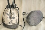 生成り地に黒で繊細な植物柄の綿麻と黒系ダンガリーリネンを組み合わせた巾着バッグ
