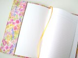 リバティの人気生地、マーガレットアニー Margaret Annie(イエローピンク)のラミネート生地(つや無)でA5サイズのノートカバーを作りました。