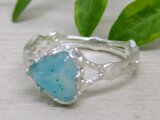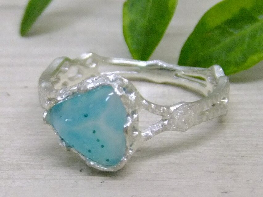 南国の海の浅瀬を思わせるようなアリゾナ産ジェムシリカを銀のレースで飾った涼し気な925リング。。レース素材そのものを銀に置換鋳造したものでリアルなテクスチャーも綺麗です**果てしなく長い時間を経てクリソコラと石英が混ざり合った鉱物の神秘。。ミルキーなカルセドニーの表層に透明度の高いジェムシリカが漂う希少な天然石による1点モノをお楽しみ下さい*リングはマット仕上げ、10~18号(推奨サイズ)の範囲を目安に調整可能、サイズ確定後にレースで包むように石留め致します*通常黒化遅延コート処理を施しますが銀そのものの経年変化がお好みの場合は『処理不要』とお申し付け下さい*黒化防止ロジウムコーティングをご希望の場合は承ります(別途1000円)