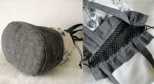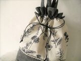 生成り地に黒で繊細な植物柄の綿麻と黒系ダンガリーリネンを組み合わせた巾着バッグ