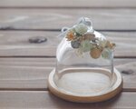 木の実などのドライ素材、ワイヤー、リボン、木製受け皿、ガラスドーム
