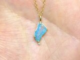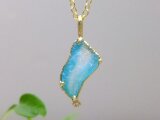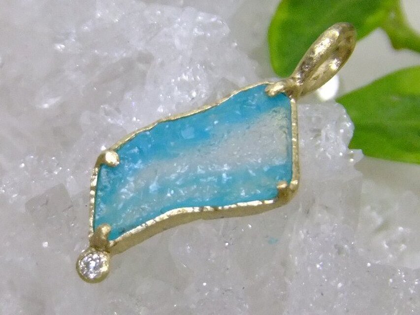 水流を思わせるようなネオンブルーとカラーレスのバイカラー*原石フリーフォームの結晶肌が煌めくアリゾナ産ジェムシリカに雫をイメージしたダイヤモンドを添えたアンティーク調K18topです*果てしなく長い年月を経てクリソコラと石英が融合した鉱物の神秘。。唯一無二の個性的なフォルム、透明度の高い極希少な原石ルースによる1点ものをお楽しみ下さい*アンティーク調マット仕上げ、トップのみの販売です*