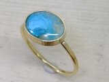 クォーツに広がるスカイブルーが涼やかなペルー産ジェムシリカをアンティーク調14kgfリングにしました*果てしなく長い年月を経て混ざり合った鉱物の神秘。。ルース裏には母岩と見られる黒色鉱石、硬度差による磨き凹み等も見られますが希少で唯一無二の天然石による1点モノです*リングは鎚目仕上げ、10~18号(推奨サイズ)の範囲を目安に調整可能、サイズ確定後に細かい鎚目の覆輪で石留め致します*14kgfは真鍮を芯に14金の被覆が施され比較的アレルギーリスクが低く気軽にゴールドの輝きを楽しめるとして人気の素材です*
