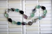 長さ18mm、横幅13mm、厚みが8mm程度のしずく型フローライトをシルク糸で結びながらつないでいったネックレスです。
