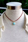今回は、直径2.5mm程度のボタンカット型ガーネットをソフトタイプのワイヤーに通し、ネックレスを作りました。ガーネットの表目にはカットがほどこされておりますので、光を受けてキラキラと美しく輝きます。前面中央・ラリマーが下がる箇所にはシルバーやゴールドのビーズを並べてアクセントにしています。