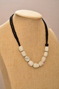表情のある約20ミリ〜12ミリ×15ミリ〜7ミリのタンブルのハウライトとフロストオニキスを繋いだネックレスです。