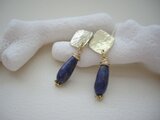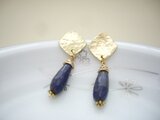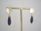真鍮のメタルシートをオリジナルシェイプにカットし、ハンマーテキスチャーを加えたパーツに、深い青のラピスラズリのしずくを下げました。