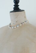 氷砂糖のようなカットの素材と豊かな色彩をもつパール、ちいさなシルバーパイライトが絶妙なバランスで光を集めるロングネックレスは心地良い落ち感と落ち着いた空気感を持っています。