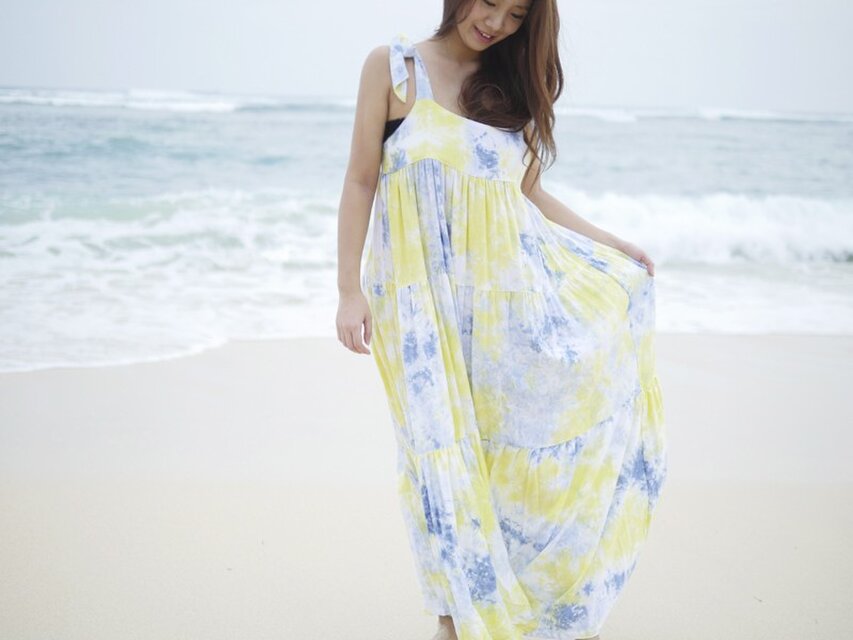 夏の新作!ムラ染めリボンティアードドレス <サマーレモン>