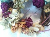 花びらが幾重にも重なった紫紅色の芍薬と、あじさい、フーセンポピー、ラグラスなどをアレンジしたエレガントでアンティークな色合いのリースです。