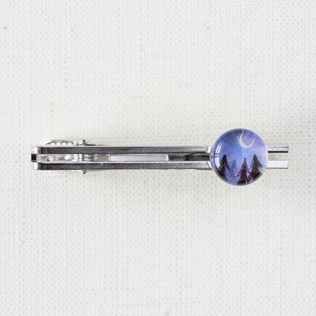 針葉樹の森に浮かぶ銀の三日月を描いた絵を、樹脂で閉じ込めたネクタイピンです。