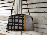 フリーハンドのちょっといびつな格子柄(カーキ色)が楽しいリネンに、マスタードイエローの帆布をポイントに。