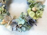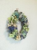 ブルー、パープル、グリーンなどのグラデーションが綺麗なあじさいと、カスミソウ、SA デージー、実などをアレンジした涼しげでナチュラルなリースです。