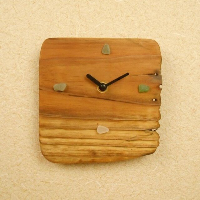 流木にかわいいシーグラス(ビーチグラス)を4つ配置した、自然味あふれる壁掛け時計です。