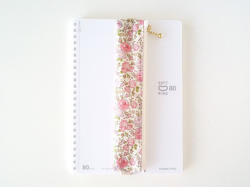 リバティの人気生地(ラミネートつや無)、フェリシテ Felicite(ライトピンク)でペンケース(A5サイズ用ゴムバンド付き)を作りました。