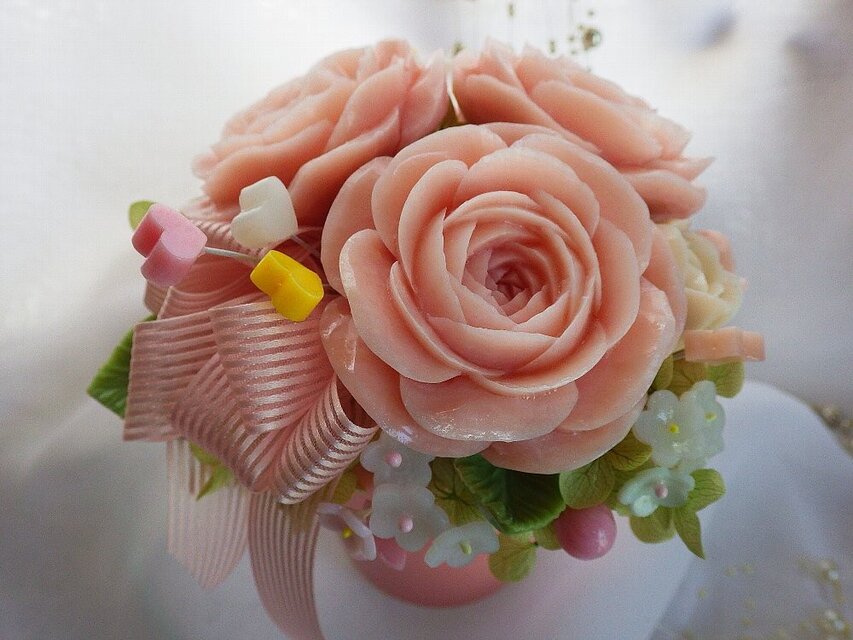 石鹸のバラ三輪盛り~ピンクポット。ソープカービング