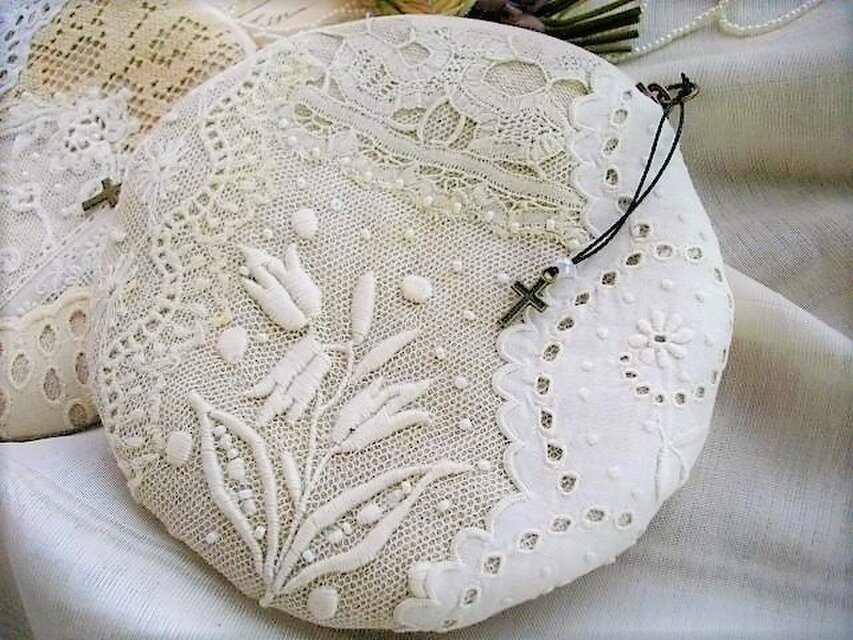 アンティークレースをリネンにのせてクレイジーキルト風にパッチワークした