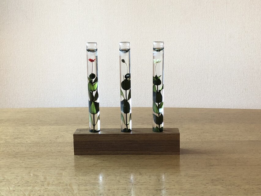 ハーバリウムを試験管を花器に見立て、透明なレジン樹脂に封じ込めました。
