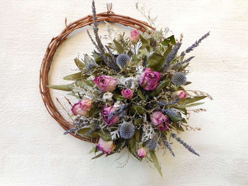 今回も素敵な作品をありがとうございます。大人っぽくて上品な色合いに一目惚れしました! 以前お迎えした薔薇のリースもとても素敵で色褪せるまで飾り続けていたのですが、今回のリースも日に何度も眺めてしまうほど素敵でうっとりしてしまいます。定位置の寝室に飾っています☆