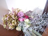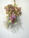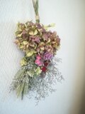 グリーンにパープルのお色が入ったあじさいと、深紅のバラ、ライトパープルのソーラーローズ、センニチコウ、ハイブリッドスターチスなどをアレンジしたナチュラルなスワッグです。