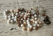 天然石マグネサイトと2種類の淡水パール、水晶のロングネックレスです。