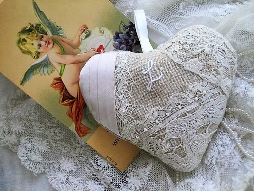 タイプの違う数種類のアンティークレースをパッチワークしたハート型のオーナメントorサシェ