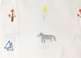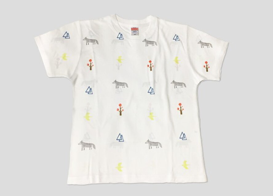 オオカミ、木や草花の手描きのイラストをパターンにし、