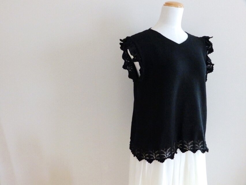 裾と肩に同じレース模様を入れ、肩はフリル仕立てにしました。