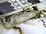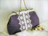 シックなパープルリネンにアンティークギュピールレースをのせたがま口バッグ