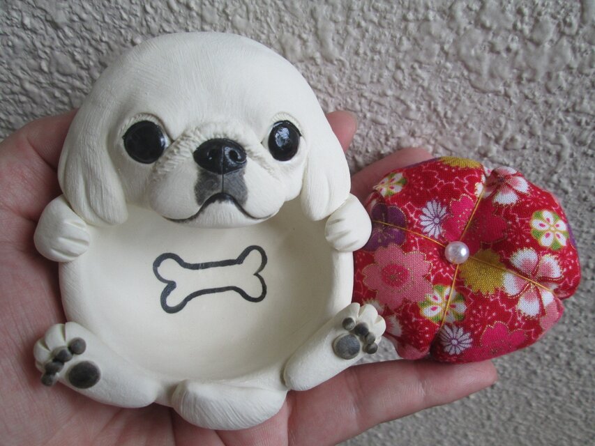 仰向けポーズが可愛いペキニーズのピンクッション(針山)です。