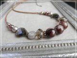 *中央にマーブル模様のものや、ツイストカット加工のものなどの、ブラウン系の様々な樹脂ビーズやガラスビーズをつなげました。
