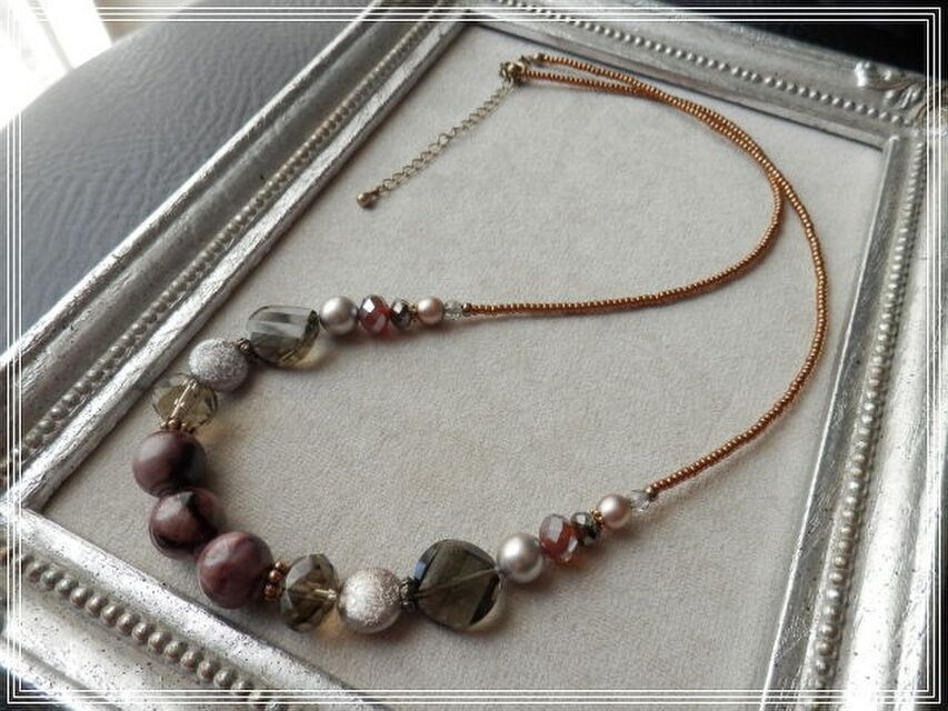 *ネック部分は、つやのあるブラウン色のシードビーズをしなやかなナイロンコートワイヤーに通しております。