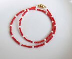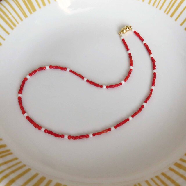 赤と白の天然さんごをつないだ、シンプルなネックレス。