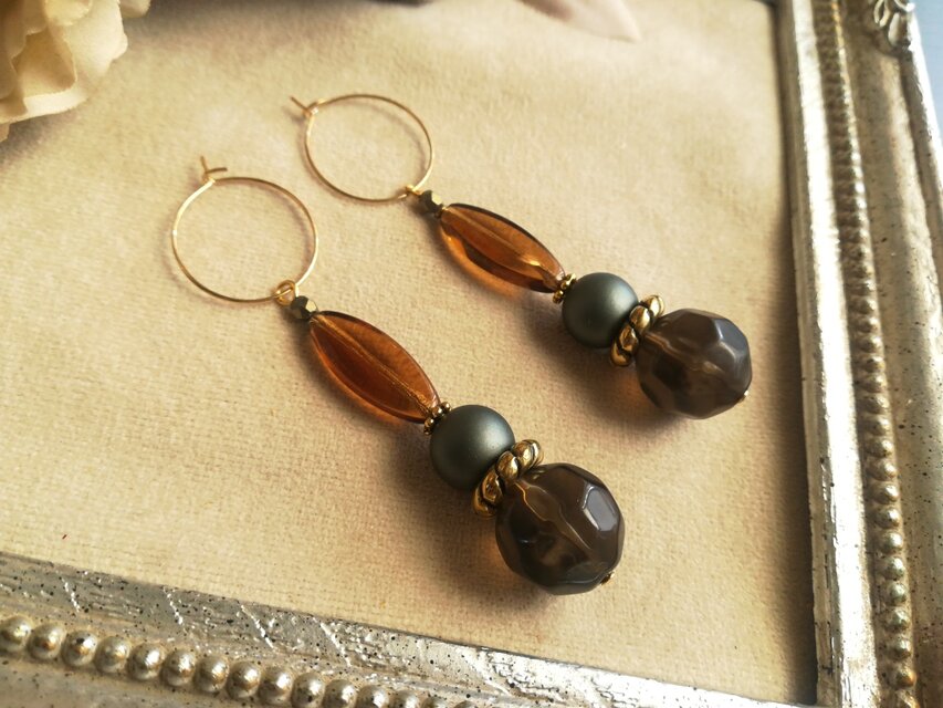 *ブラウンがかった琥珀色のチェコビーズと茶色のアクリルビーズ、マットな濃いめのグレーケシパールで作りました。