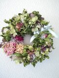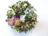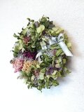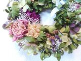 レッド、ベージュ、ピンクの三色の芍薬をメインに、グリーンにパープルが入ったあじさい、深いグリーンのキンポウジュ、カスミソウ、ミニバラなどをアレンジしたボリュームのあるナチュラルなリースです。