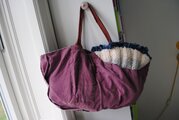 羊毛のふわふわを飾ったバッグです。全体は落ち着いたパープルのコーディロイの生地。