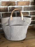 内布はmodaのUSAコットンでレイアウトしています。持ち手はヌメ革を使用しています。