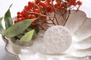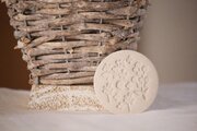 陶土にオリジナルの草花の消しゴムはんこを捺したブローチです。