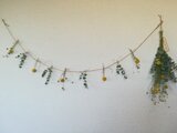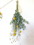黄色いまん丸なお花のグラスぺリアグロボーサと、小さな丸いお花のパイナップルフラワー、ユーカリなどをアレンジしたシンプルでナチュラルなガーランド*スワッグのセットのお品です。