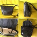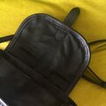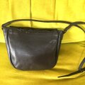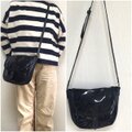 黒のイタリアンレザーにパテントレザー(エナメル革)を合わせたふた付きショルダーバックです。レザーをふちどりに使いエナメル革をふたとポケット部分に使いました。ふたの下のポケットは便利です。