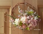 ふわふわピンクのラナンキュラスヘリクリサム、アナベルをギュッとまとめて雲竜柳に。可愛らしいWreathが出来ました。夏のなごりをゆっくりとお楽しみください。縦16cm横16cmほど。サイズ表記は白樺小枝の先端までとなります。