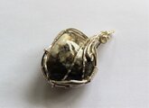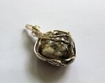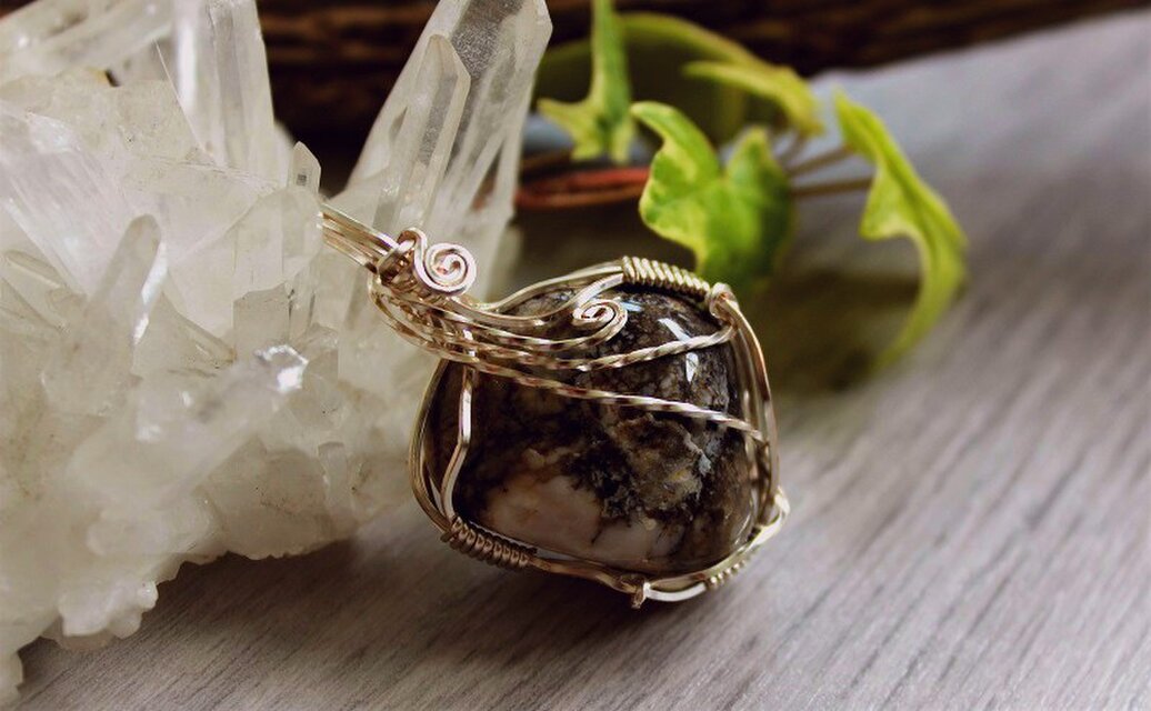 白とグレー、黒の美しい模様が入ったマーリナイトのタンブルを、シルバーのワイヤーで巻きました。