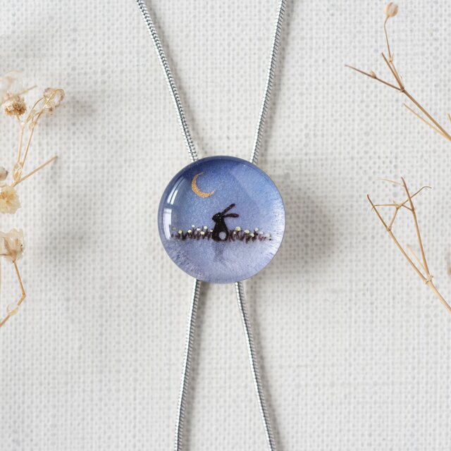 夜明けのうさぎを描いた絵(原画)を樹脂でとじこめたループタイです。
