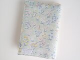 生地の色は地の色が、少し濃淡のあるライトグリーン、花の色にブルー、イエロー、ライトピンク、ホワイトなど、動物の色にグレージュ、イエローなどが使われています。