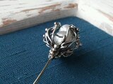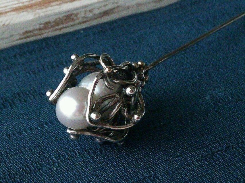 ナチュラルホワイトカラーの双子パールをシルバーの線で細工して、包み込む様なデザインでつくったピンブローチです。