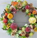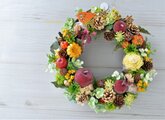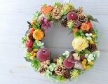 以前見かけた素敵な葡萄のリースが忘れられず、オーダーをお願いしました。実りの豊かさが手のひらに重さとして感じられるような豊穣のリースです。 瑞々しい葡萄、色々な実もの、最後にはなりえ様おすすめの小さなりんごをあしらっていただき、ため息が出るほど贅沢にできあがりました! いつも素敵な作品をありがとうございます。