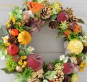リース素材:アーティフィシャルフラワ-(造花):アップル・パンプキン・黄色の小実・ユーカリ、など。自然素材:松かさ・ワタカラ ゴールドペイント・スターアニス ゴールドペイント・カラマツ・黄色のソラフラワー、など。その他:ハロウィンオーナメント(枝に掛けてありますので、取り外しできます)、など。